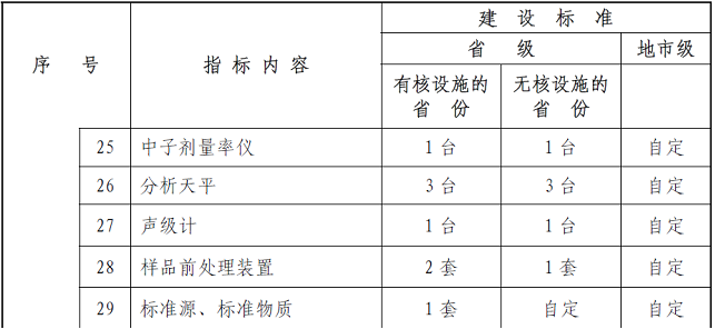 基本仪器设备是保障辐射环境监测与监察机构开展辐射环境质量监测(包括土壤、空气、水体、生物样品、陆地、口岸、海洋、电磁等项目的环境质量监测)、核设施和辐射源监督性监测(包括各类核设施、铀矿冶、放射性废物处理处置设施、电磁辐射设施、放射性同位素与射线装置、伴生放射性矿等)、日常核与辐射安全监督检查和执法的基础条件。辐射环境监测与监察机构必须配置的仪器设备的最低配备标准见表4。