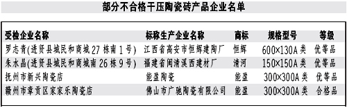 本报讯记者龚汉斌报道:近日,江西省质监局公布了近期对干压陶瓷砖产品进行省级产品质量监督抽查的结果。质监部门共抽查了51家生产企业生产的52批次产品,抽样合格率90.4%。抽查结果表明,本次抽查的陶瓷砖其放射性核素限量指标均达到了标准规定的要求;但仍有部分产品存在一些问题。